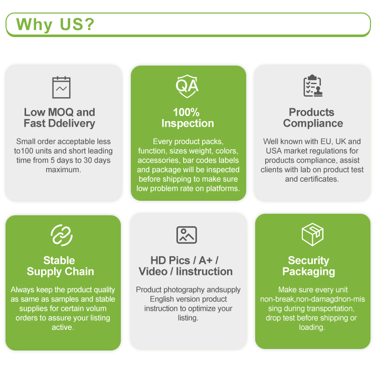 Q1 : Puis-je obtenir des échantillons ?Oui, tous les échantillons sont disponibles mais doivent être collectés.Q2 : Acceptez-vous les OEM pour les produits et les emballages ?Oui, tous les produits et emballages acceptent les OEM.Q3 : Avez-vous une procédure d’inspection avant l’expédition ?Oui, nous effectuons une inspection à 100 % avant l'expédition.Q4 : Quel est votre délai d’exécution ?Les échantillons durent 2 à 5 jours et la plupart des produits de masse seront terminés en 2 semaines.Q5 : Comment expédier ?Nous pouvons organiser l’expédition par voie maritime, ferroviaire, aérienne, express et FBA.Q6 : Si le service de codes-barres et d'étiquettes Amazon peut être fourni ?Oui, service gratuit de codes-barres et d'étiquettes.