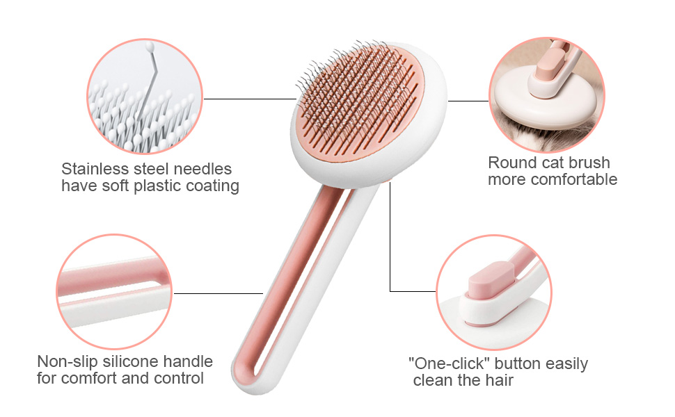 Comfortable and Nonslip Handle. Our cat shedding brush is designed with a comfort-grip and nonslip handle, and this self cleaning cat brush also has a massage function for your hand and you won’t get tired easily when you brush your pet.